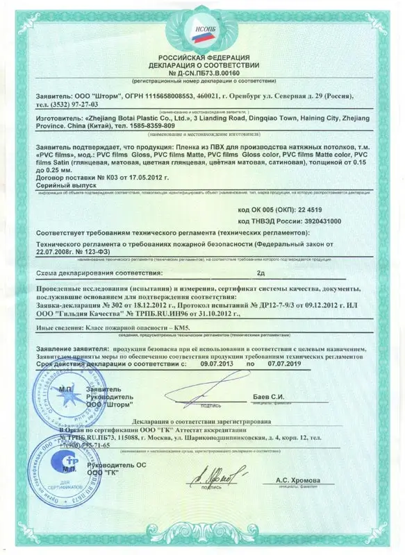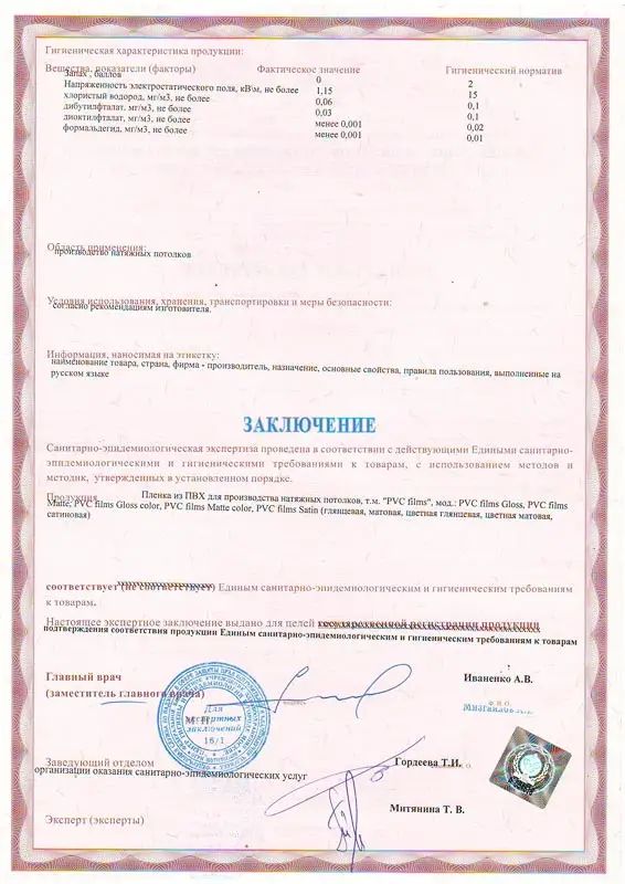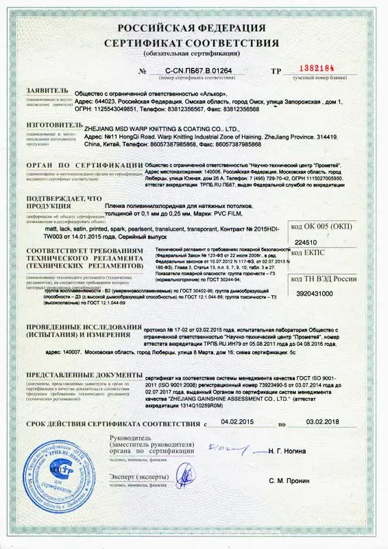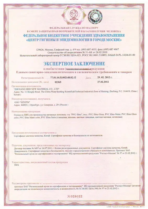 Мы используем пленку ПВХ марки MSD. Данная пленка прошла 3 вида сертификации, что дает право с увернностью заявлять о её экологичности, безопасности и качестве.
