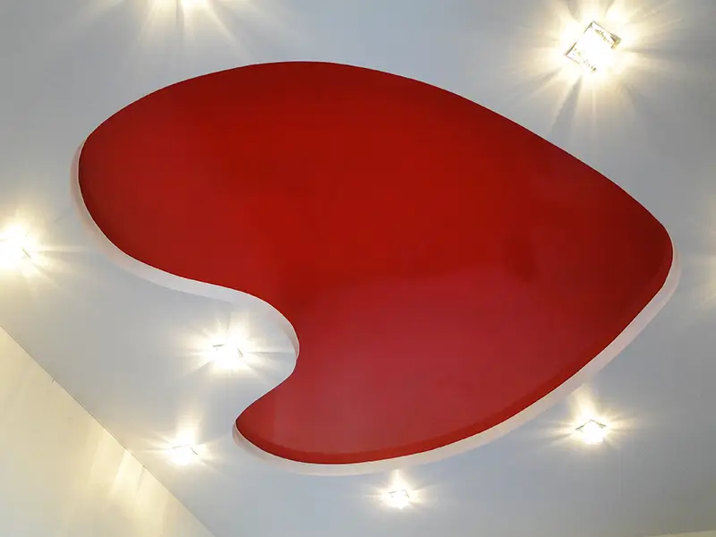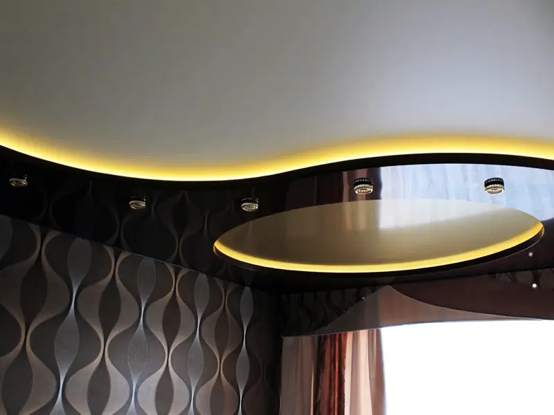 При создании изогнутых двухуровневых потолков могут использоваться как профили с насечками, так и изогнутая фанера или гипсокартон, закрепленные на направляющих профилях. При конструировании важно добиться плавной линии, поэтому шаг установки учащается.