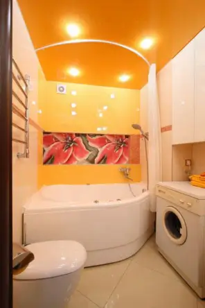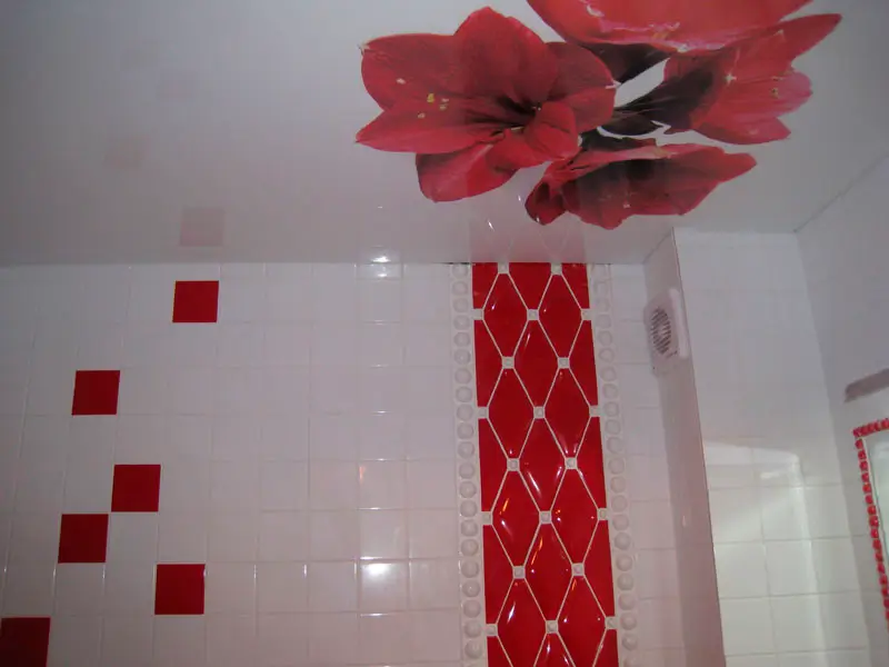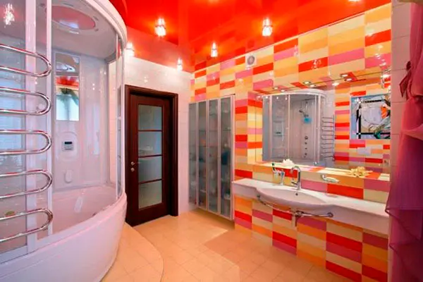 - Если Ваш кафель включает яркие цветовые пятна, эту палитру можно подчеркнуть с помощью яркого натяжного потолка, это внесет изюминку в интерьер.