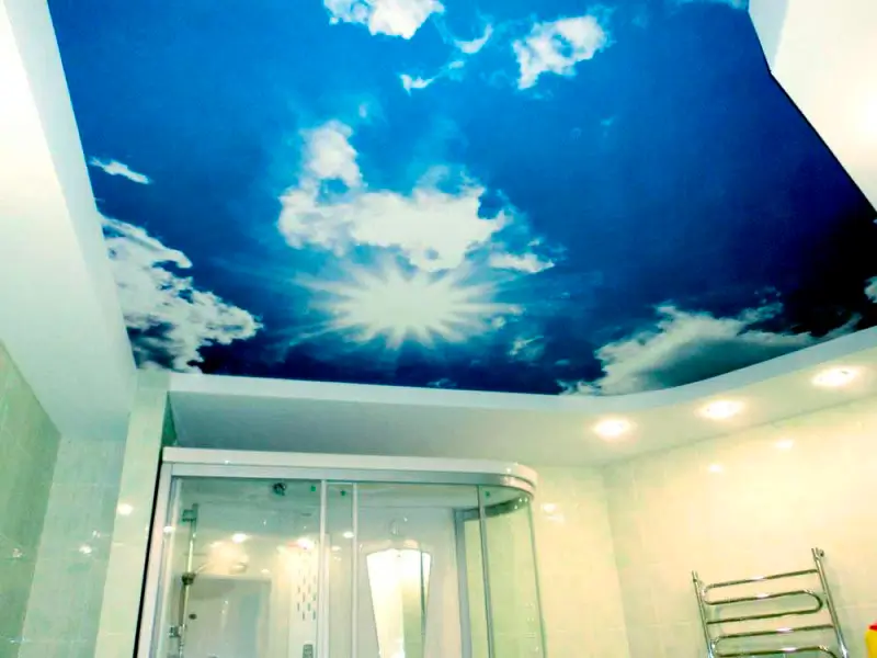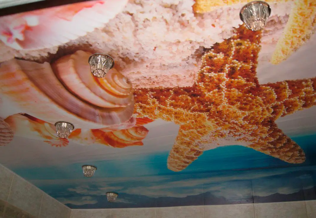 - Хорошо вписывается в интерьер ванной комнаты натяжные потолки с рисунком морского пейзажа, декоративными рыбками или звездным небом.