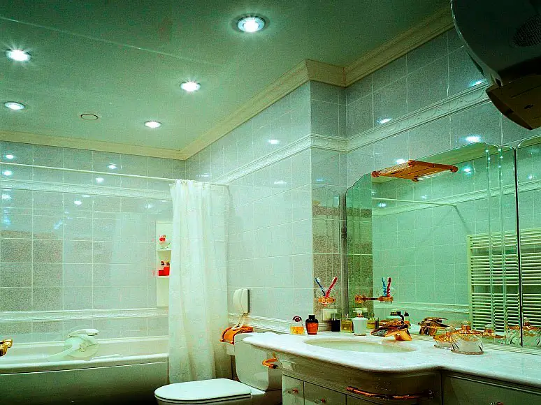 - В ванной комнате хорошо использовать встроенные светильники, при прочих вариантах на зеркальной поверхности будут возникать нежелательные блики. Так же, чтобы разнообразить и добавить оригинальность ванной комнате, можно использовать светодиодную подсветку.