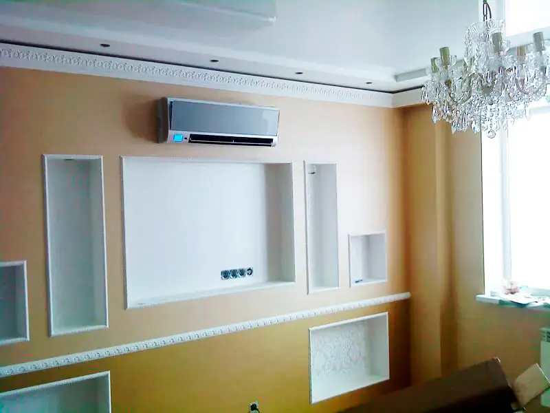 - Выполнить обходную конструкцию. В таком случае над кондиционером не будет натяжного потолка, но такое решение требует определенных трат.