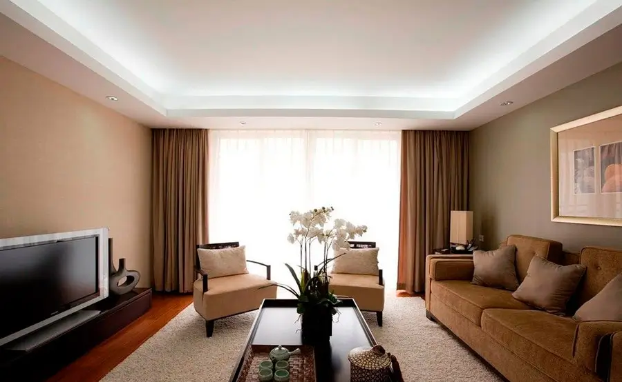 Сатин представляет собой матовое полотно с небольшим эффектом отражения. Особенно выигрышно такая фактура смотрится в сочетании с точечными светильниками.