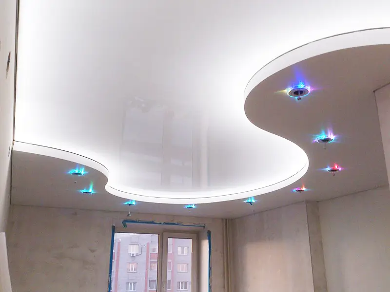 После установки натяжного полотна монтажные работы могут значительно ухудшить эстетичность потолка, поэтому освещение необходимо планировать заранее.