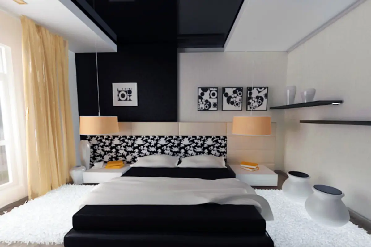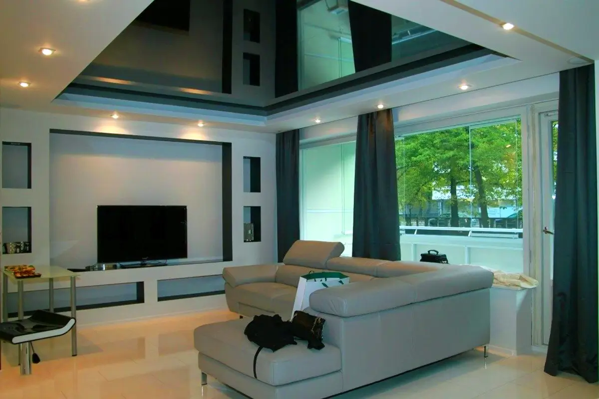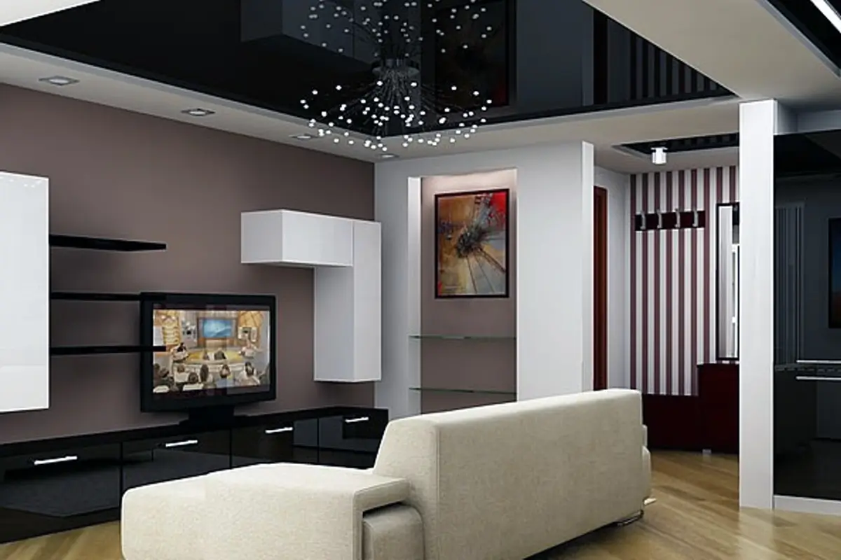 - Не используйте в маленьких помещениях. Темные цветовые решения в дизайне интерьера приводят к зрительному уменьшению пространства. Спасти ситуацию может правильный подбор оттенков для всех поверхностей комнаты. Так, натяжной потолок черный глянец может быть компенсирован белыми стенами или полом.