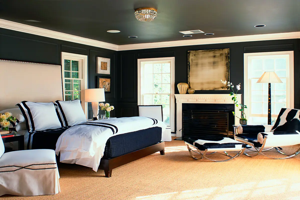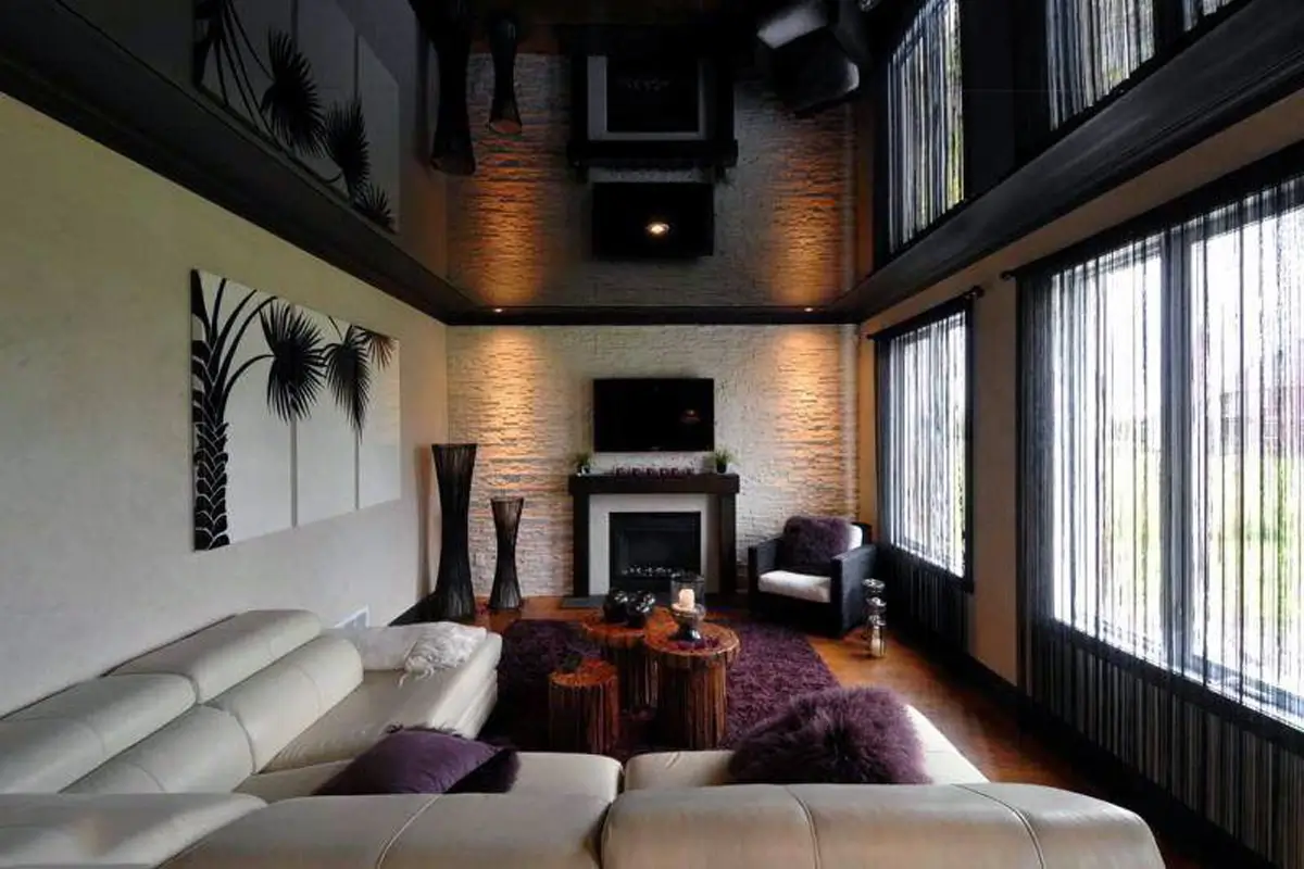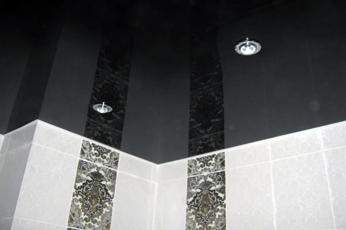 Использование в интерьере черного цвета представляет собой экстравагантный способ преобразить помещение. Черный цвет характеризуется невысокой светоотражающей способностью, поэтому используется в отделке помещений, в которых потолок не должен привлекать особого внимания.